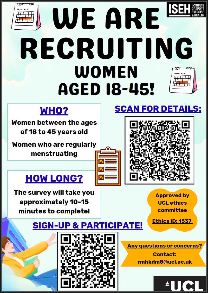 Researchers at University College London are looking at the role of passive exercise on the relief of menstrual cycle symptoms. This one is open to pretty much everyone that has a period. More on the poster below or here.